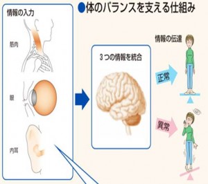 私たちの体では、耳、眼、筋肉などからの情報が脳に送られ統合されます。そして、脳で統合された情報が首や腰、手足などの全身の筋肉に正確に伝わることにより、体のバランスを正常に保っているのです。これらの情報に異常やくい違いが起こるとバランスが崩れ、その結果めまいが起こります。